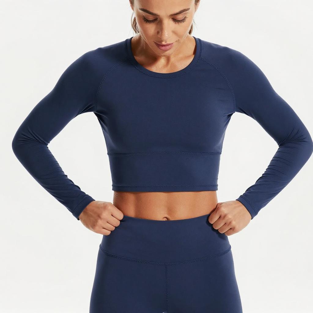 Photograph of a young woman with light brown skin and long brown hair in a ponytail, wearing a black sleeveless crop top and gray athletic shorts with white trim and drawstring. She stands in profile, looking down, against a white background with gray borders. Her toned arms and flat stomach are visible.