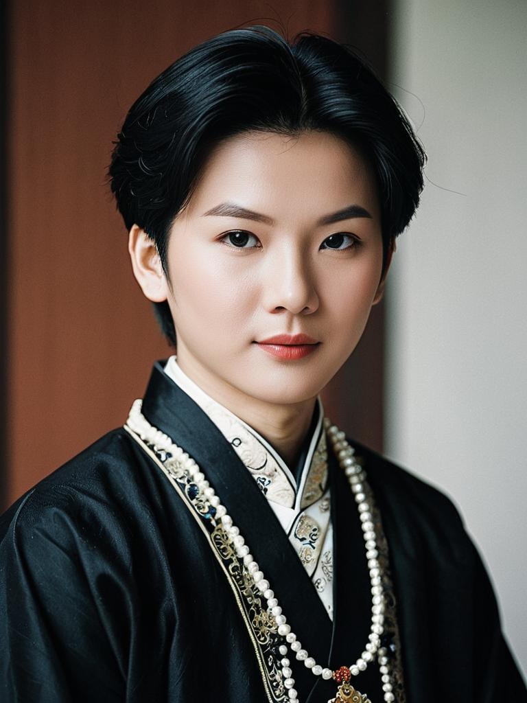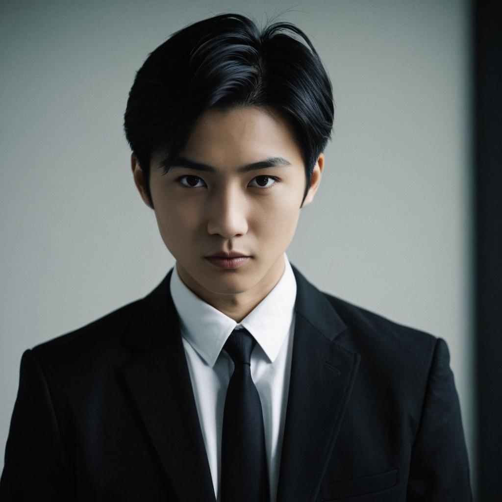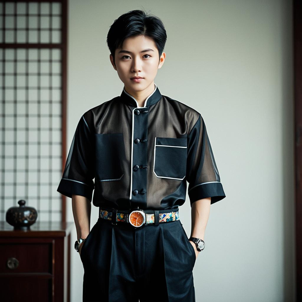 Tang suit costume,1boy,male focus,solo,black hair,blurry background,watch,blurry,hands in pockets,wristwatch,looking at viewer,see-through,belt,pants,black pants,shirt,realistic,asian,short hair,chinese clothes