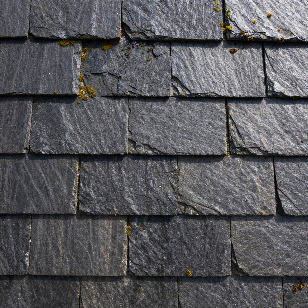 Close-up shingles seamless texture featuring overlapping slate tiles, showcasing textured surfaces with cracks, moss growth, and weathering effects, arranged in a consistent pattern suitable for photorealistic renders and nature-inspired designs.