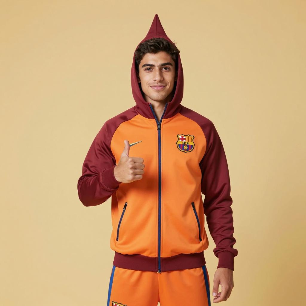 Wiggles lachy costume, photograph of a young man wearing a Barcelona FC track suit, hood up with a small pointed top, orange and maroon colors, giving a thumbs up with his right hand, yellow background, standing, smiling, casual pose, daylight, realistic style, simple background, sporty outfit, team on chest, slightly blurry edges