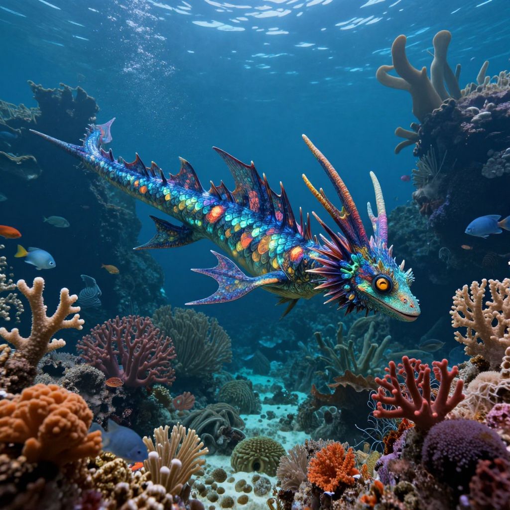 Vibrant, bioluminescent dragonfish with colorful scales and finned head swims through a rich, coral-filled underwater scene. Digital artwork.