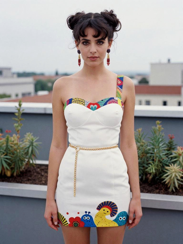 Photograph of a fair-skinned woman with wavy brown hair in a red and white checkered dress, holding a woven bag, standing in a