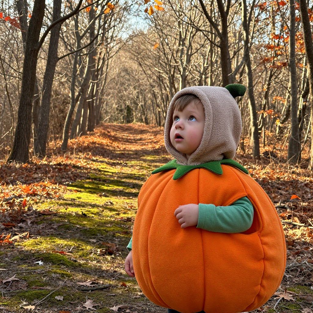 A young child is wearing a handmade pumpkin costume with a soft, textured hood and a green cotton shirt, their eyes wide with curiosity as they stand in a quiet forest during early autumn. The trees are bare, their branches bare and exposed against a golden-hued sky, with patches of orange and red leaves scattered on the ground. The forest atmosphere is peaceful and slightly mysterious, with dappled sunlight filtering through the sparse canopy, casting long shadows on the mossy path behind the child. The child is looking slightly upward, as if noticing something in the trees or sky, capturing a moment of wonder and innocence in nature.