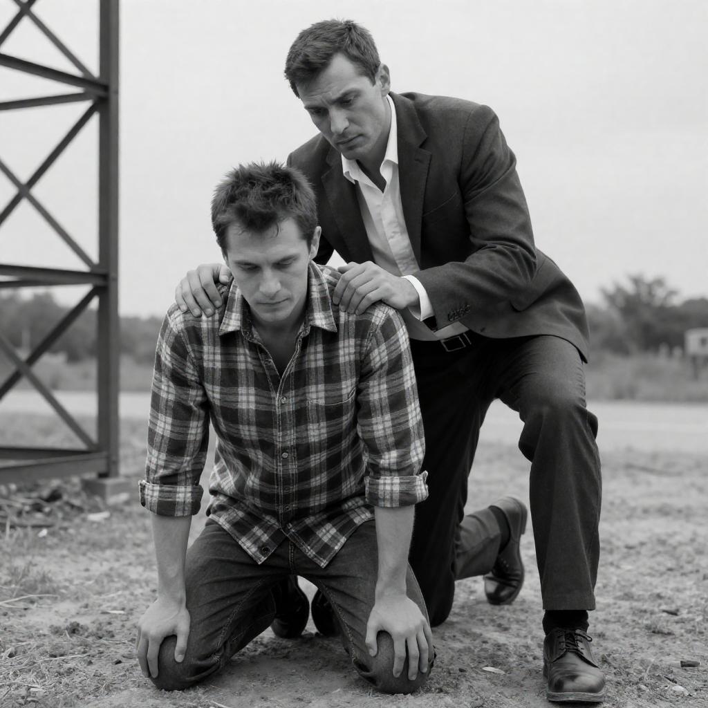 Black-and-white photograph of a medical scene in a dimly lit, industrial-style room. Four men in dark clothing surround a patient on a table, one man examining the patient's arm. The background features metal grates and hanging lights. The patient, with short dark hair, appears unconscious. The men's expressions are focused and serious.