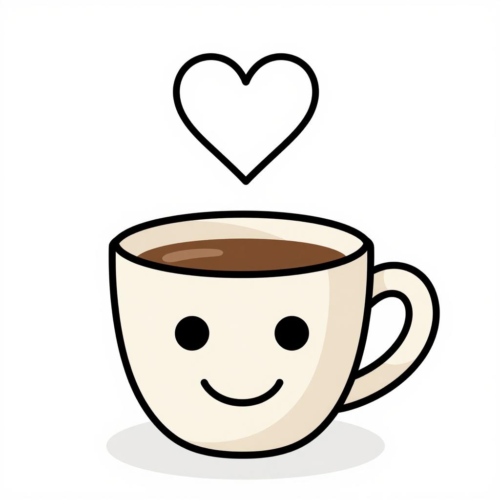 Simple cartoon-style illustration of a beige coffee cup with a smiling face, filled with coffee. A heart-shaped steam rises from the cup, symbolizing love and warmth. The image features bold outlines and a clean white background, suitable for product and merchandise designs.