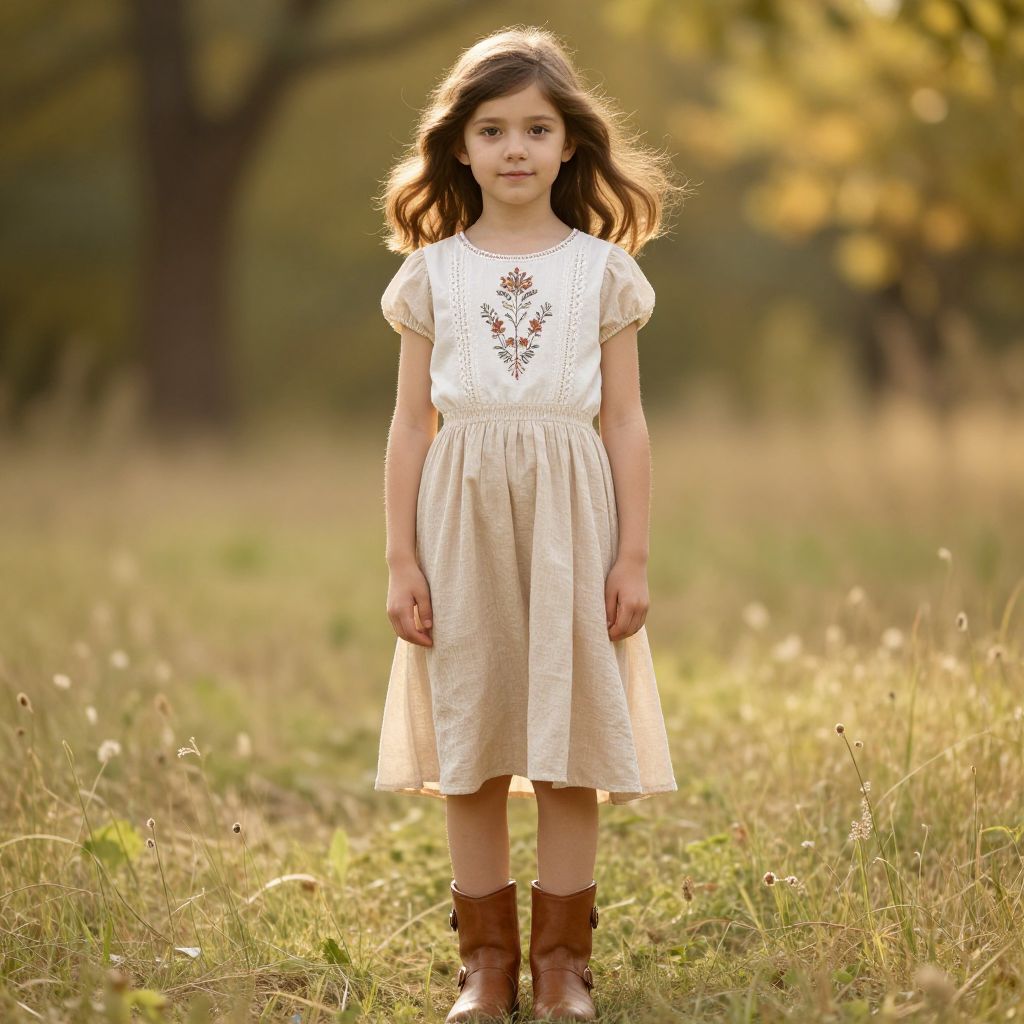 Photograph of a young girl standing in a sunlit, grassy meadow. She has long, wavy brown hair and a fair complexion. She wears a cream-colored, short-sleeved dress with intricate black embroidery on the chest, and brown leather boots. The background features blurred, golden sunlight filtering through tall trees, creating a warm, autumnal atmosphere. The girl is centered in the frame, looking directly at the camera with a neutral expression. The grass around her is green with hints of dryness, and small wildflowers are scattered throughout.
