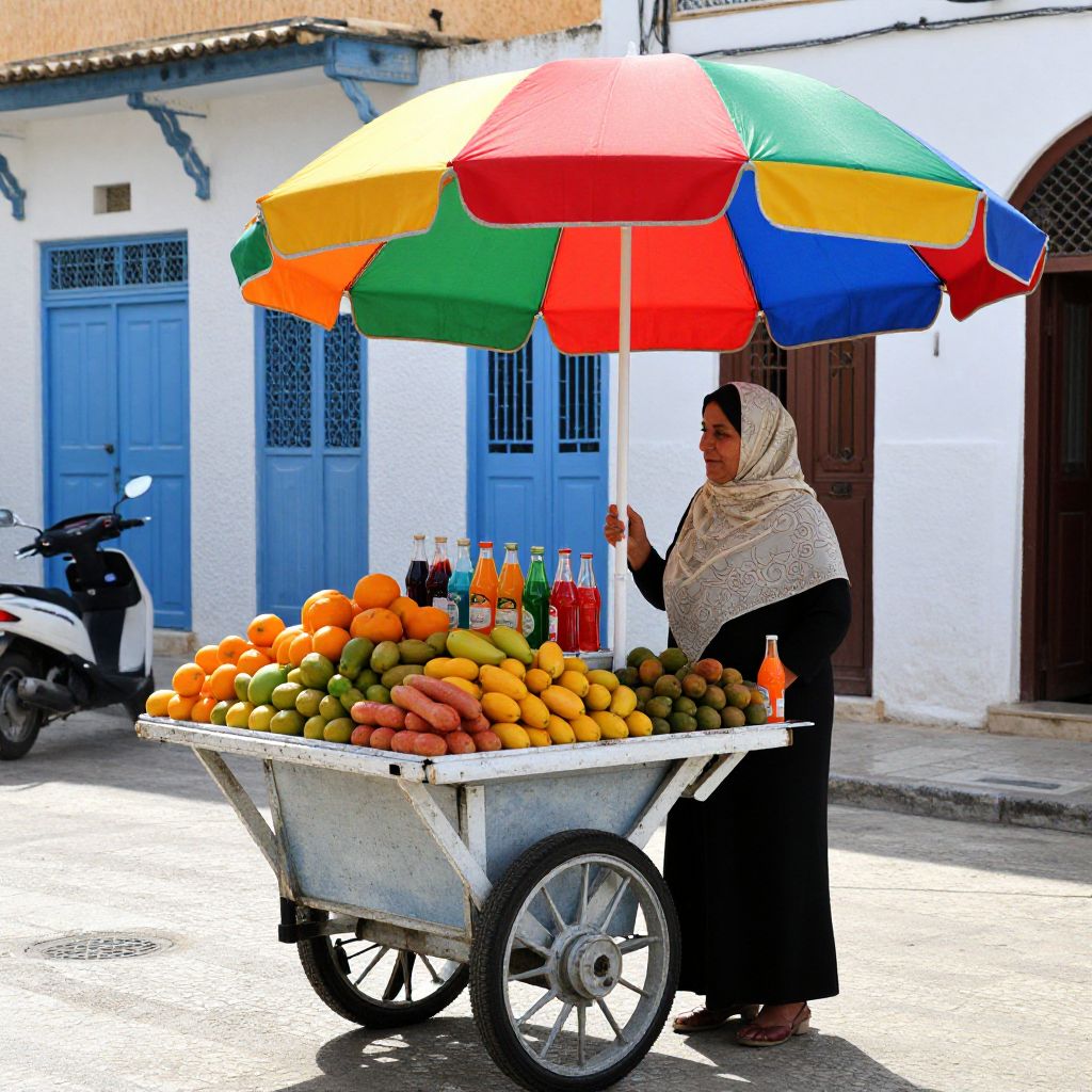 A woman in a headscarf sells fruits and drinks from a cart under a colorful umbrella in a vibrant Tunisian street scene.