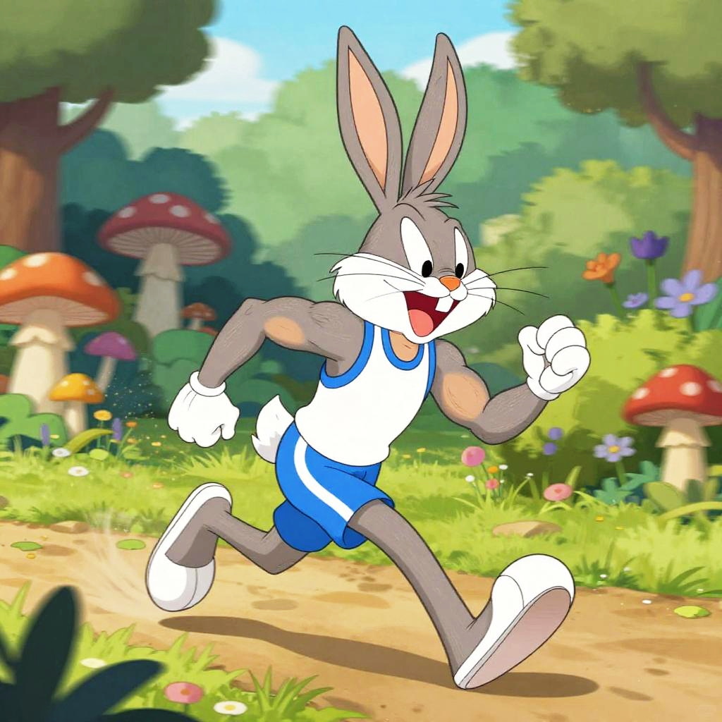 Bugs Bunny muscle, muscular anthropomorphic bunny in sporty outfit running through a wild garden, exaggerated muscles rippling, bright cartoon colors, motion blur effects, detailed natural surroundings with flowers and mushrooms, energetic and fun mood