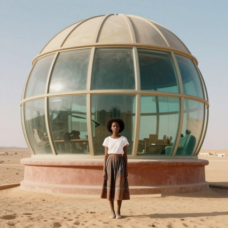Photograph of a young Black woman standing in front of a spherical, glass-domed building in a desert. She has a medium brown skin tone, short curly black hair, and is wearing a white short-sleeve blouse with a dark, patterned knee-length skirt. The glass dome has gold-colored metal frames and reflections of the clear blue sky. Inside, faintly visible, are tables and chairs. The desert sand surrounding the building is light beige, and the sky is clear. The woman stands barefoot with a relaxed posture, looking directly at the camera.
