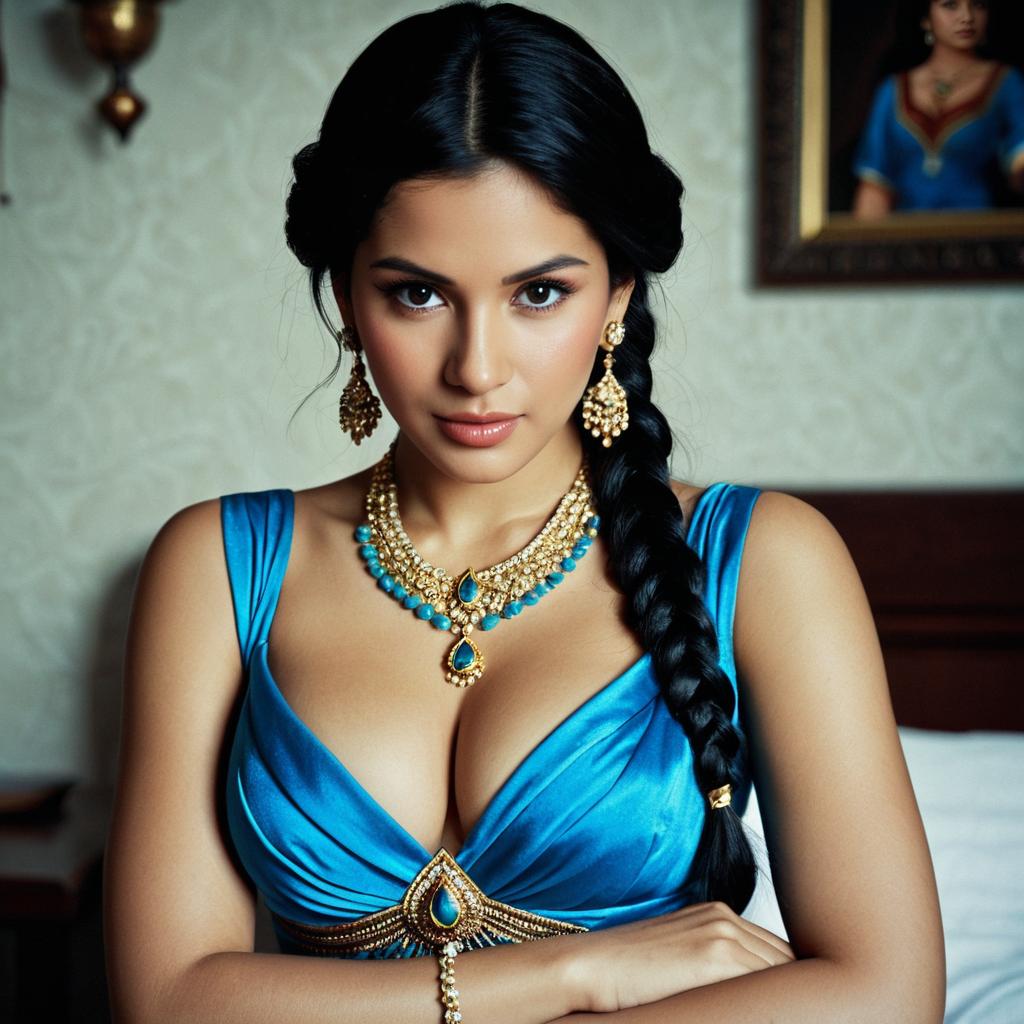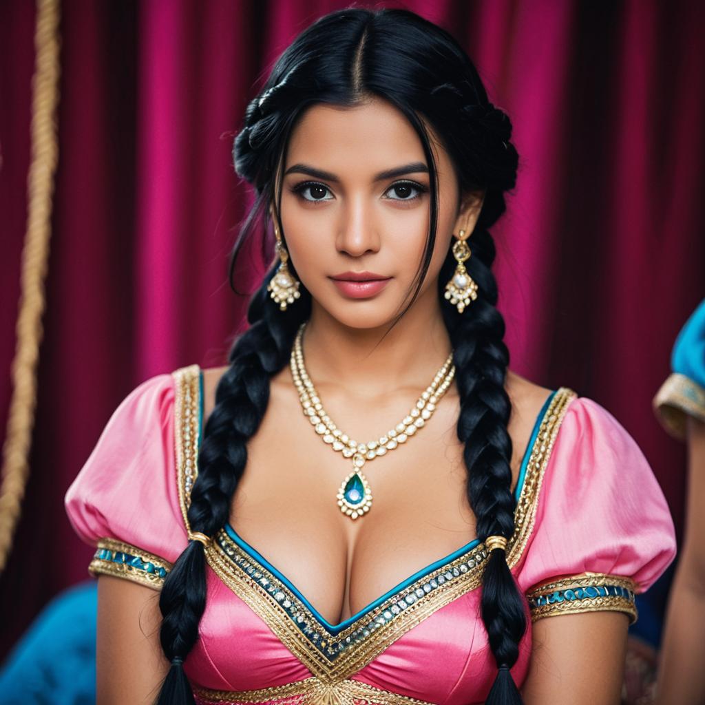 Cosplay princess jasmine,1girl, solo, jewelry, long hair, bracelet, earrings, brown hair, dark-skinned female, standing, brown eyes, breasts, dark skin