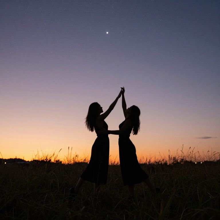 In a meadow bathed in twilight's embrace, two silhouettes dance with the stars, their movements weaving a celestial ballet of freedom and connection, as if their souls reach out to touch the infinite expanse above.