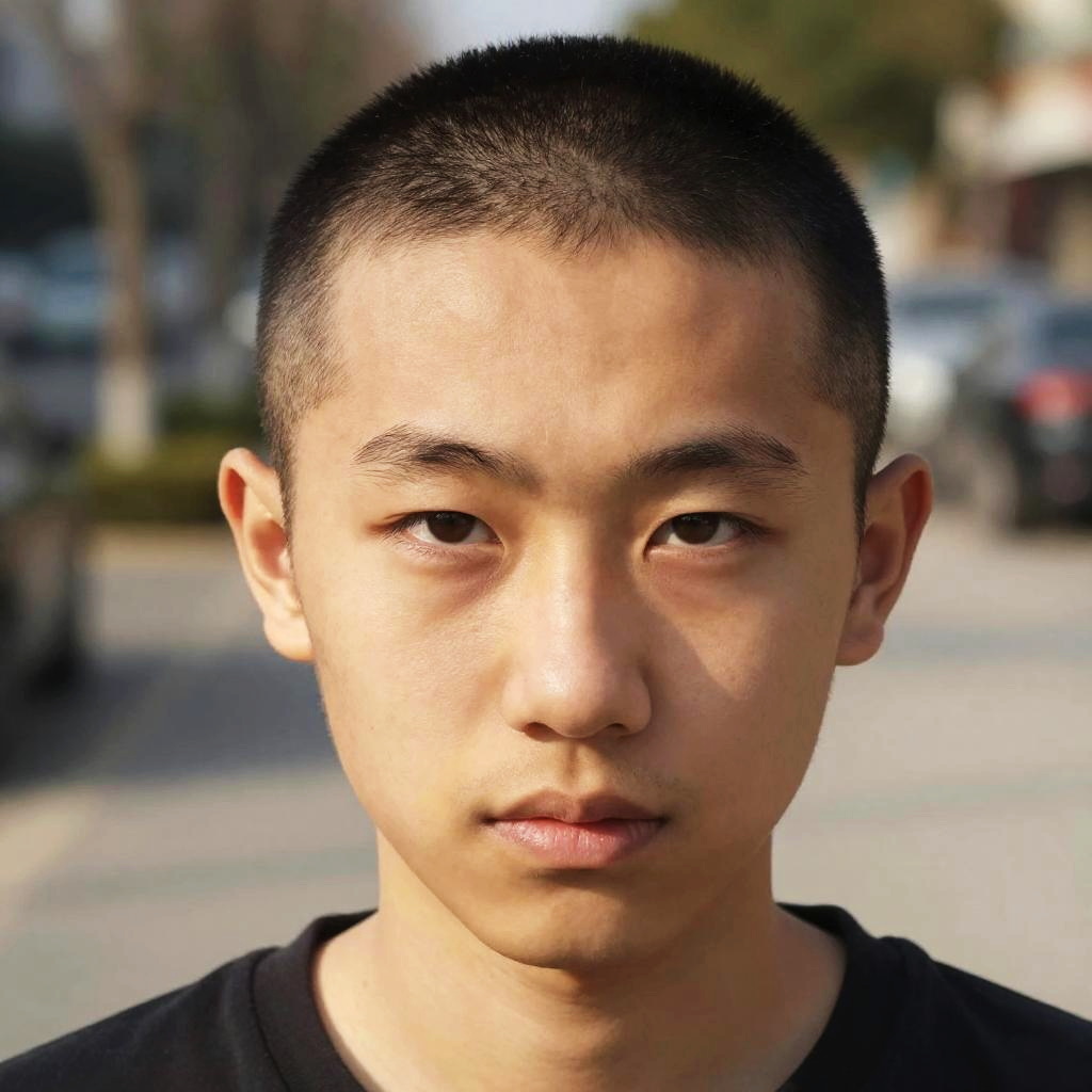 What i would look like with a buzz cut, vibrant portrait with stylish buzz cut hairstyle, energetic color palette, dynamic lighting that highlights contours of the face and shaved hair, creative urban background, fashion-forward look