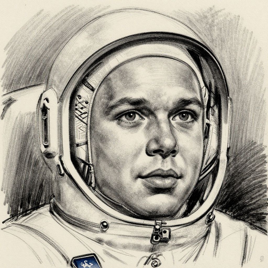 Black and white, detailed pencil drawing of a serious-faced astronaut with large helmet, visible straps, and textured background. Realistic, close-up portrait.