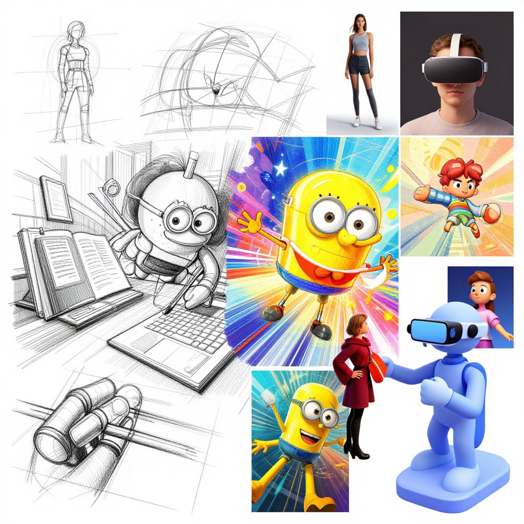Editing art illustrated as a dynamic collage of sketches, vibrant digital paintings, and 3D models, with virtual reality elements integrated, bright contrasting colors and sharp details, highlighting the creative process of refining and enhancing artwork in a high-tech environment.