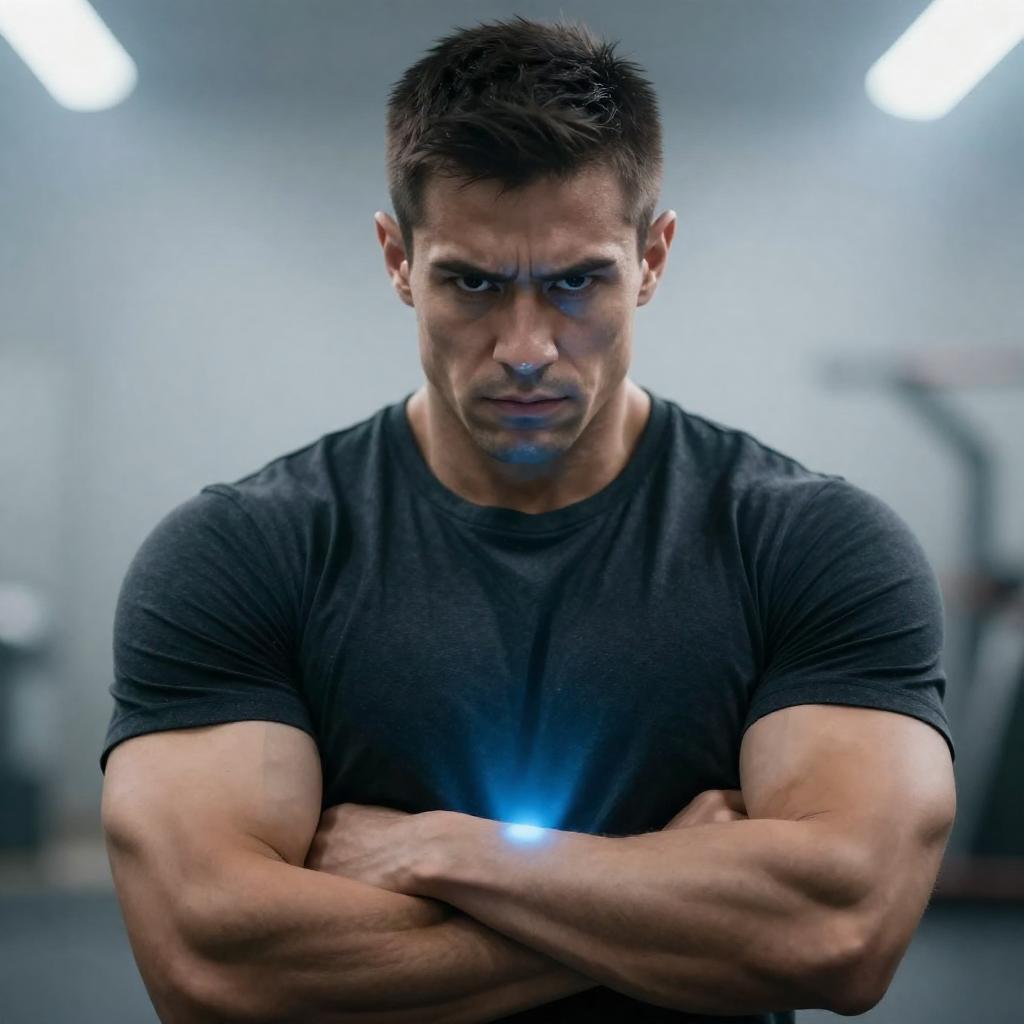 Photograph of a muscular man with short dark hair, intense expression, wearing a dark ured shirt, arms crossed, holding a glowing blue object in front of him. Background is blurred with bright light beams.