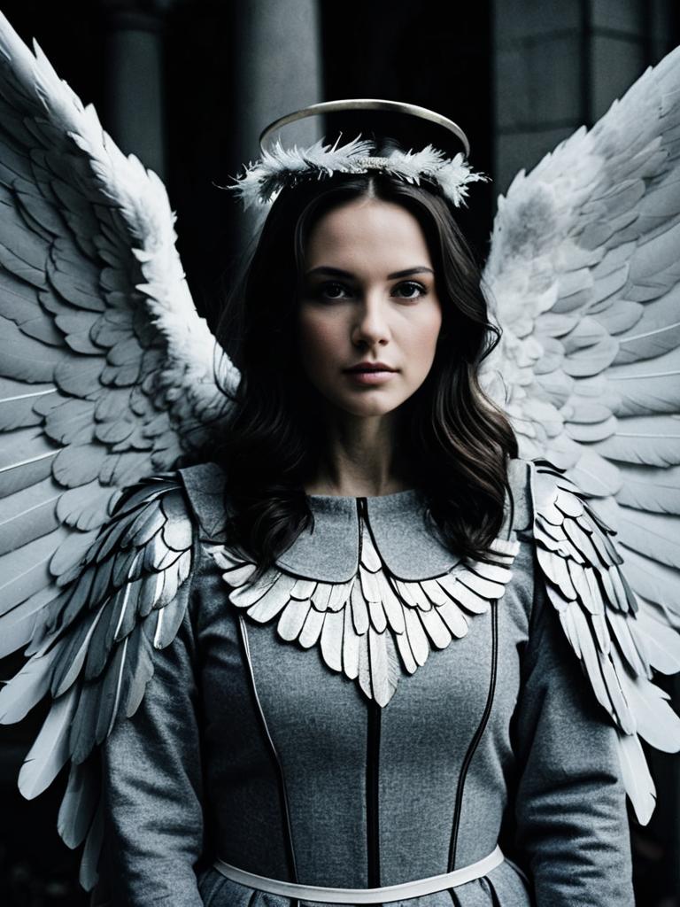 Woman in Grey Angel Wings Costume, cinematic realism, dramatic angelic photo