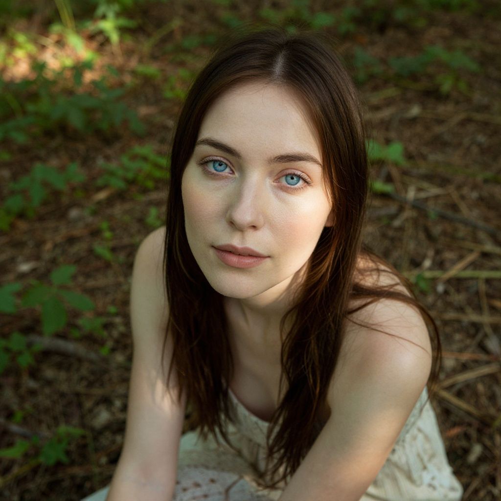 Photograph of a young Caucasian woman with fair skin and long, straight, dark brown hair, gazing directly at the camera with blue eyes. She has a slender build and is wearing a sleeveless, light-colored dress. She is kneeling on the ground in a forest setting, with sunlight filtering through the trees, casting dappled light on her face. The background consists of green foliage and brown pine needles. Her expression is calm and slightly curious, with minimal makeup enhancing her natural beauty. The image has a soft focus, emphasizing her face against the slightly blurred forest background.
