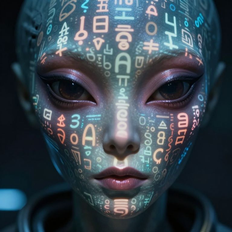 This is a digital CGI artwork depicting a close-up of a humanoid face with a metallic, futuristic texture. The face is illuminated with glowing, multicolored text symbols (numbers, letters, and geometric shapes) in bright blue, red, and white on its smooth, reflective surface. The person has large, dark, almond-shaped eyes with subtle purple and blue highlights, and their lips are slightly parted. The background is dark, creating a stark contrast that emphasizes the glowing text on the face. The overall style is cyberpunk, with a focus on futuristic and technological elements. The lighting and text give the image a high-tech, otherworldly feel.