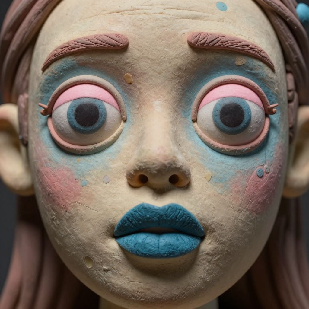 Photograph of a surreal, clay-like humanoid mask with exaggerated, wide eyes, blue lips, pink and blue face paint, and brown hair.