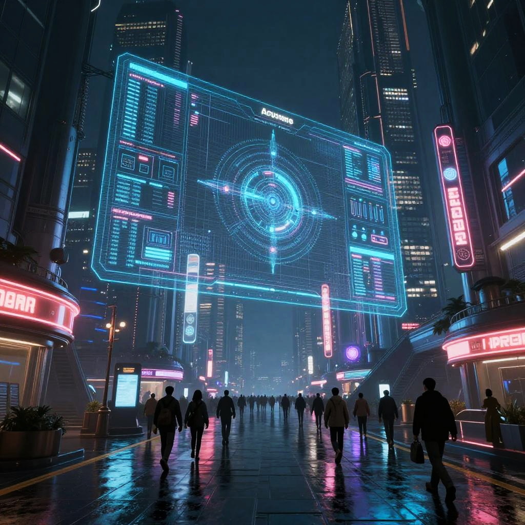 Neon-lit, rainy city street at night, vibrant blue and pink digital signs, reflections on wet pavement, tall skyscrapers, people walking