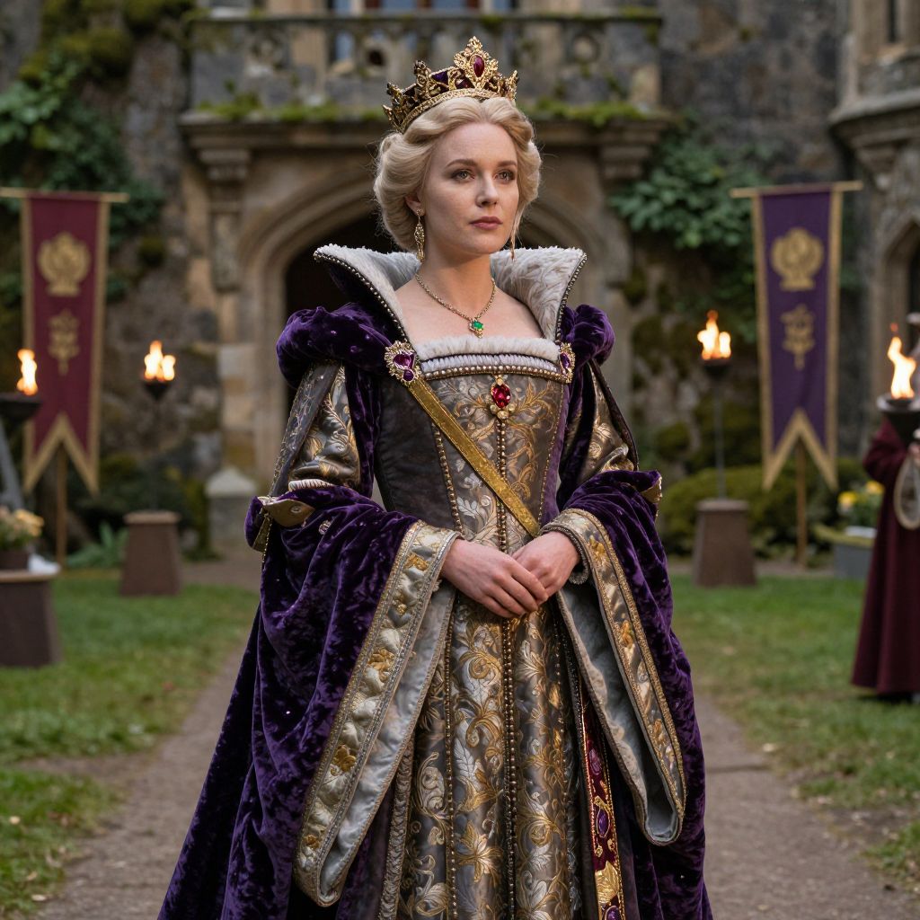 A photorealistic image of a noblewoman dressed as a medieval queen, the costume featuring a layered gown made of velvet and silk, with intricate beadwork and a brocade bodice, paired with a royal mantle and a sash of purple and gold. She has a composed, dignified face with fair skin, blonde hair pinned in a elaborate crown-like style, standing in a mossy castle courtyard during a royal festival with torches and banners in the background.. The woman has big breasts and cute face