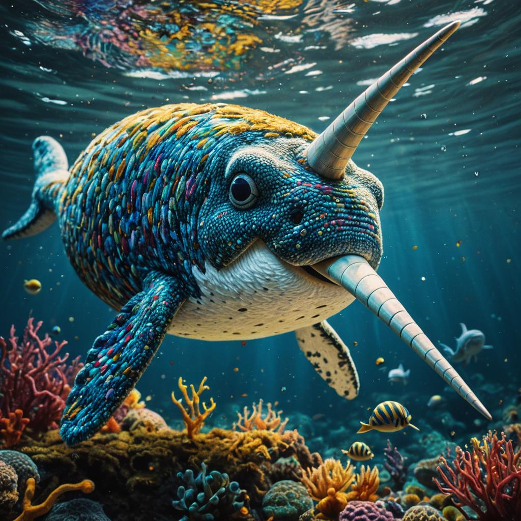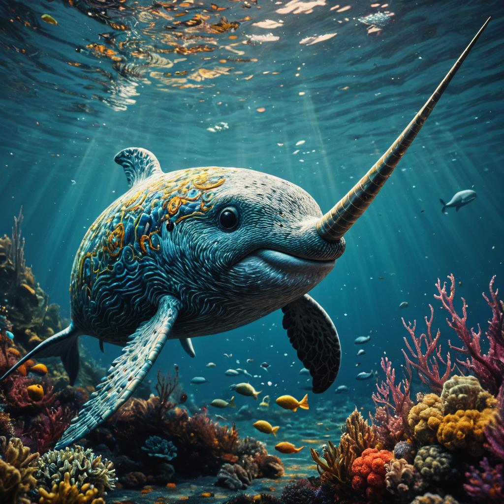 Intricate Narwhal Muppet with Floral Patterns Underwater