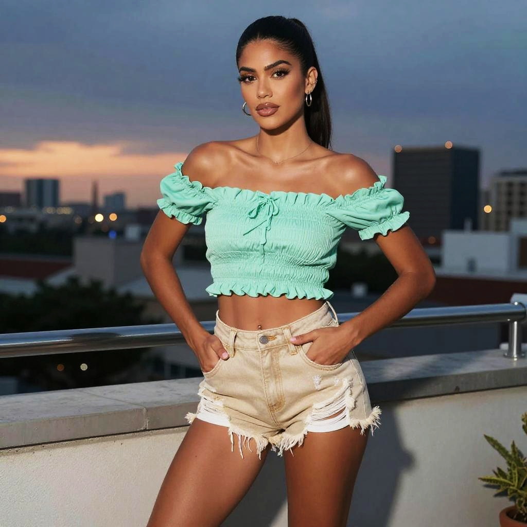 3.something else woman looking at camera, sideview, wearing ultra-short distressed high-waisted denim Daisy Duke shorts and off-the-shoulder smocked crop top in sun-bleached beige denim shorts with mint green cropped blouse on bronzed Latina woman with sleek high ponytail posed standing confidently with hands on hips on a rooftop terrace in city skyline backdrop with dusk settling and glowing lights, twilight indigo sky merging with cityscapes, cinematic summer street-style fashion photography, high resolution, ultra-detailed