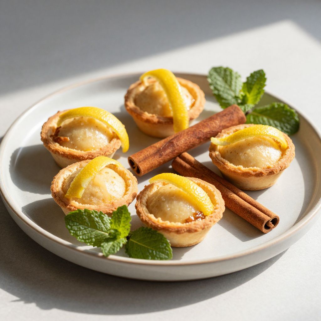 Pasteis arranged artfully on a ceramic platter with cinnamon sticks and lemon peel garnish, surrounded by sprigs of fresh mint, soft morning sunlight casting warm shadows, elegant and appetizing composition for gourmet food photography.