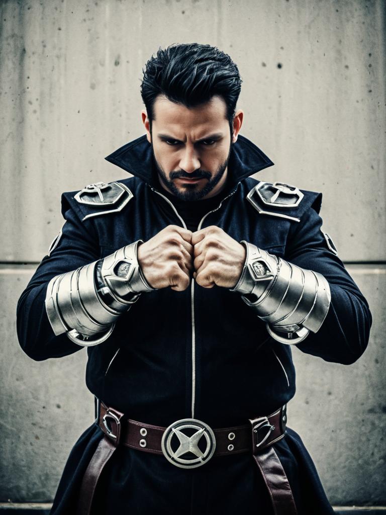 Portrait of a serious man in a black cosplay outfit inspired by video game character Knuckles. The costume features a black jacket with a high collar, silver metallic gauntlets, and a brown belt with a circular silver buckle. The man has dark hair styled back and sports a beard, standing against a neutral concrete background in a confident pose.