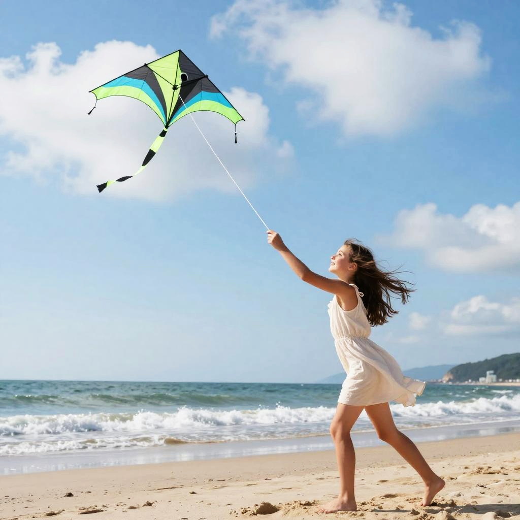 12 yo girl beach, girl flying a kite near shoreline, blowing breeze moving light dress, expansive horizon, bright blue sky with fluffy clouds, sense of freedom and happiness