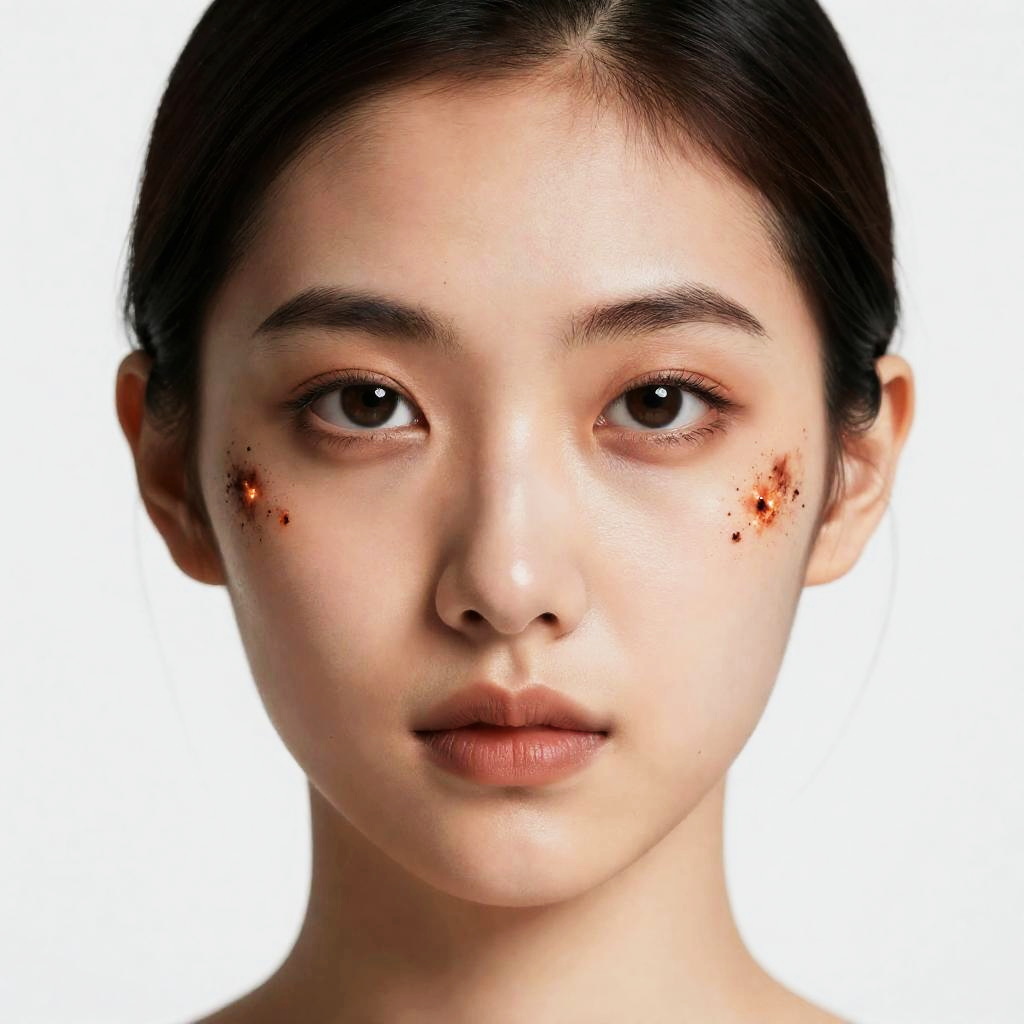 Portrait of an Asian woman with clean skin and dark hair pulled back, featuring realistic war paint makeup resembling small explosions on both cheeks. The image captures a neutral expression with a plain white background, emphasizing the detailed and artistic makeup resembling fiery bursts.