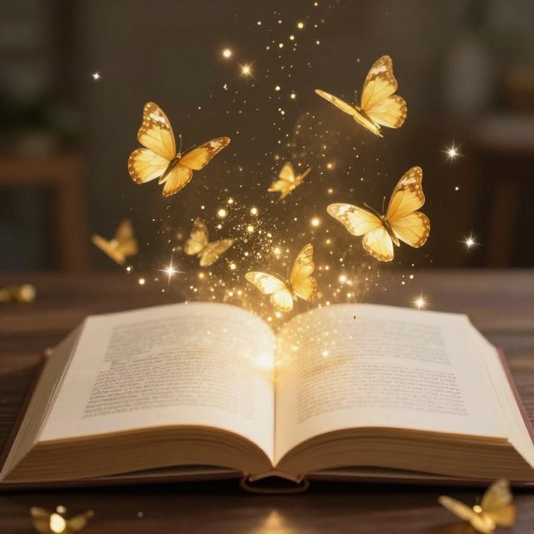 Photograph of an open book emitting glowing golden butterflies and sparkles, creating a magical, ethereal effect against a dark background.