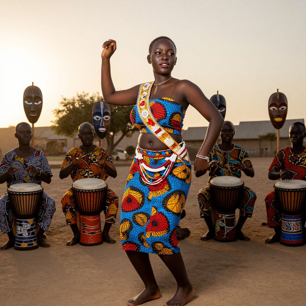 A vibrant young woman with smooth, dark skin and expressive, almond-shaped eyes wears a full traditional African costume from Senegal — complete with a hand-painted fabric dress, a ceremonial sash, and a layered beaded belt — dancing in a village courtyard at sunset, surrounded by colorful traditional drums and painted wooden masks.. The woman has big breasts and cute face