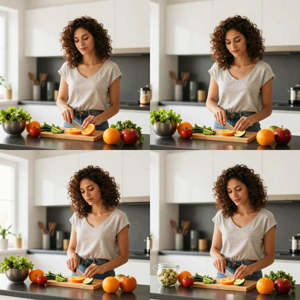 Photograph of a curly-haired woman with light brown skin, wearing a white, short-sleeved, V-neck t-shirt and blue jeans, slicing oranges on a wooden cutting board in a modern kitchen. The countertop is adorned with an orange, red apple, a potted green plant, and a bunch of green herbs. The background features white cabinets, a silver kettle, and utensils in a holder. The image is a four-frame collage, each showing the woman in slightly different poses of slicing the oranges. Bright, natural light illuminates the scene.