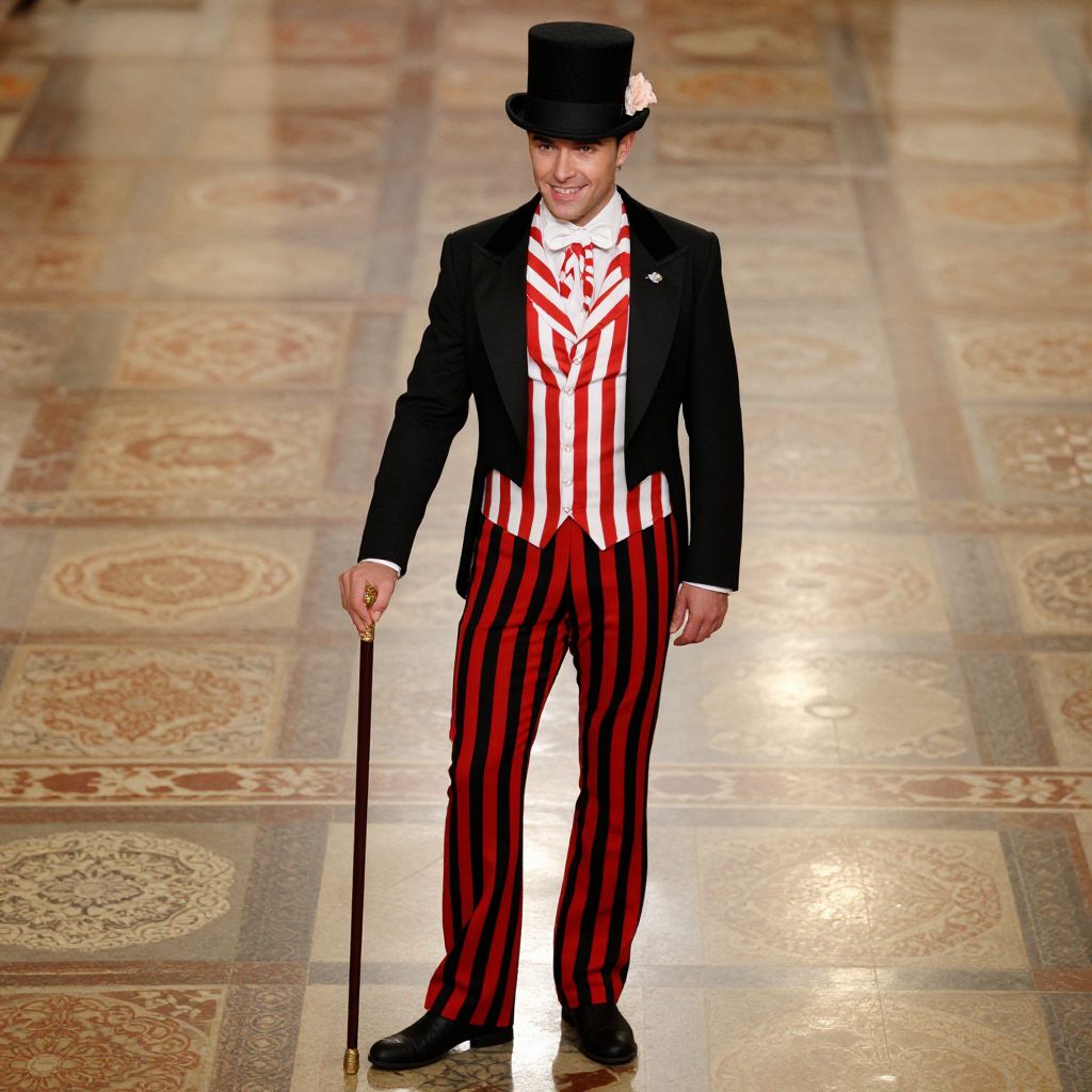 A handsome man in his late 20s with slicked-back dark hair and a confident smirk is wearing a black top hat adorned with a delicate pink flower. He is dressed in a striking red and white striped outfit, complemented by a sharp black jacket and black and red striped pants. The man is holding a polished cane in his right hand, and he is standing elegantly on a highly reflective, patterned tiled floor.