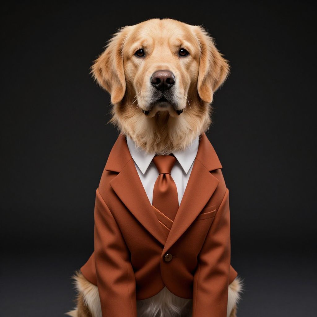 Photograph of a golden retriever wearing a brown suit jacket, white shirt, and matching tie, seated against a black background.