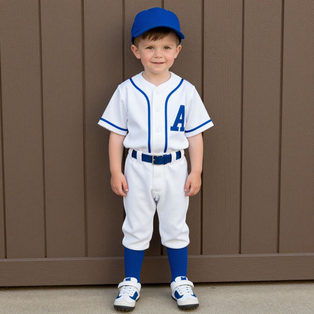 Vintage Child Baseball Costume, boy in a baseball uniform standing in front of a wooden wall