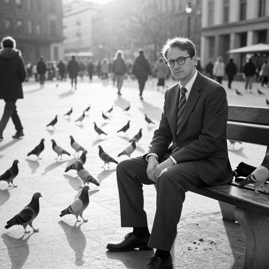 Black-and-white photograph of a suited man with glasses sitting on a bench in a busy city square, surrounded by pigeons. Blurred pedestrians in the