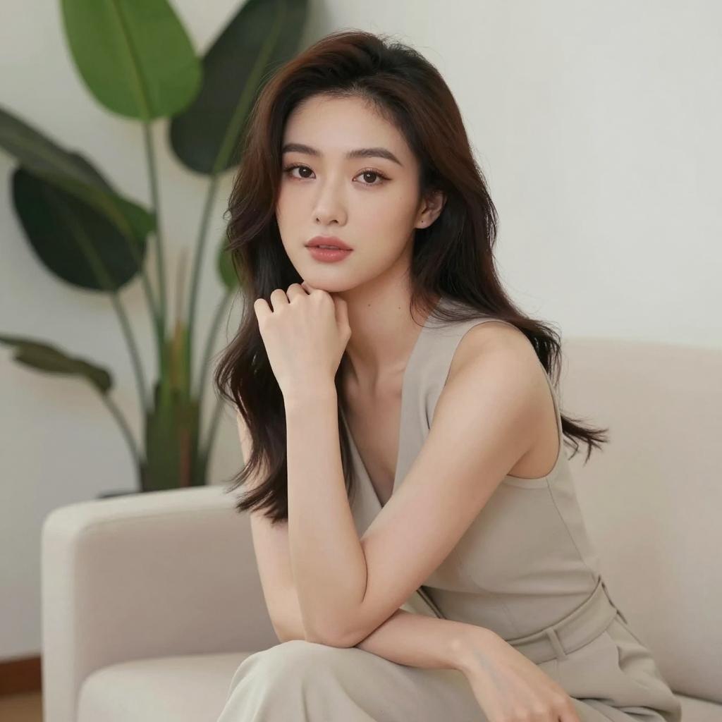 Portrait of an Asian woman with fair skin and dark hair tied in a ponytail, wearing a strapless white dress. She is seated indoors near a window with soft natural light, sipping a cold green drink with ice and a red straw from a clear glass, holding it in her right hand.