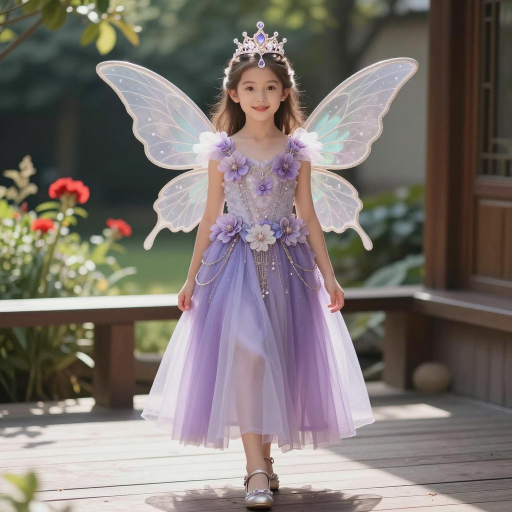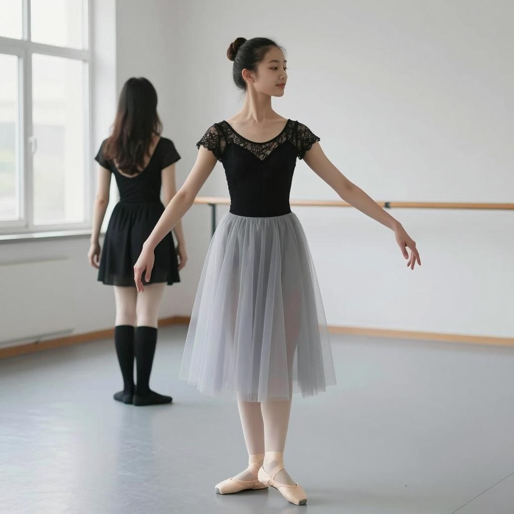 Pink ballerina costume adult, photograph of young girl, standing, full body, outdoor, daytime, soft natural light, pink ballet dress, off-the-shoulder, puffed sleeves, tulle skirt, corset-style bodice, pink hair bun, ballet flats, green leafy plant in background, beige wall, shadow on ground, cute, elegant, fair skin, slender, delicate, poised, serene expression, subtle smile, casual pose