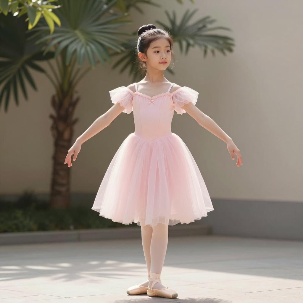 A young Asian girl wearing a pink off-the-shoulder ballet dress with puffed sleeves and a tulle skirt stands poised outdoors during the daytime. She has a neat pink hair bun, fair skin, and ballet flats, with a serene expression. The background features a beige wall, a green leafy plant, and soft natural light casting shadows on the ground.