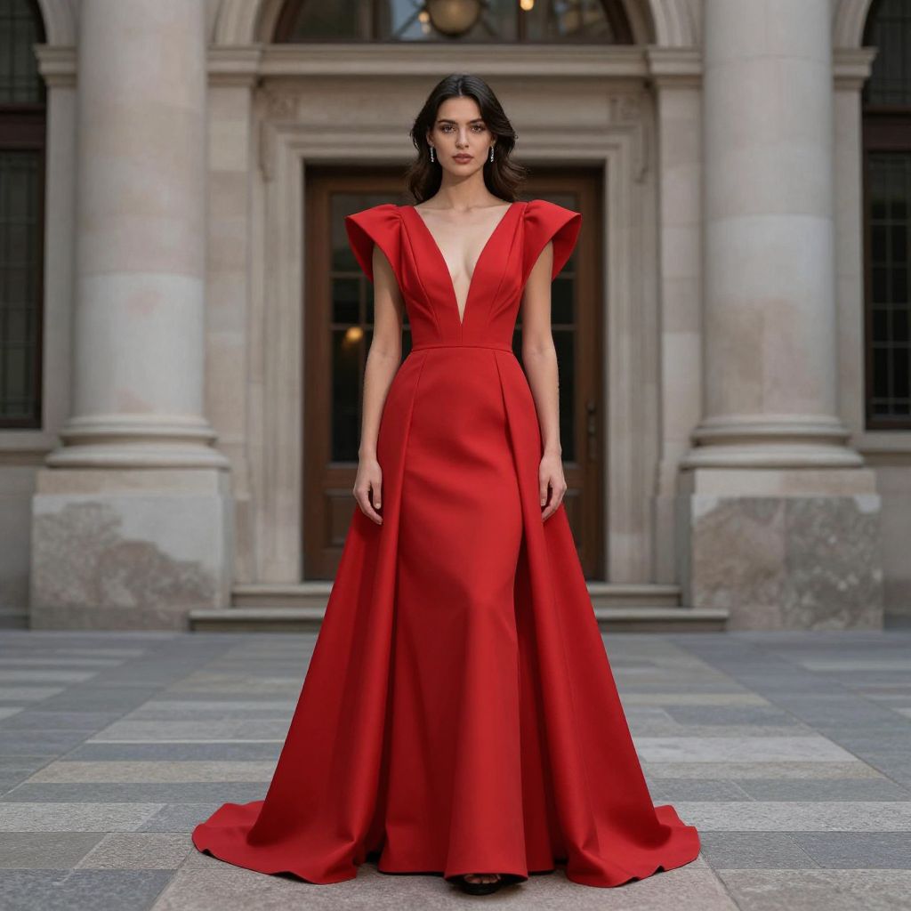 Photograph of a young woman with medium-dark skin and long, wavy black hair standing confidently in an elegant, architectural setting. She wears a vivid red, floor-length evening gown with a deep V-neckline and dramatic, wide shoulders. The gown has a fitted waist and a full, flowing skirt with a slight train. The background features large, stone columns and a grand, arched doorway with dark, wooden panels. The ground is paved with grey stone tiles. The woman's makeup is subtle, highlighting her natural features. The lighting is soft, emphasizing the richness of the red gown.