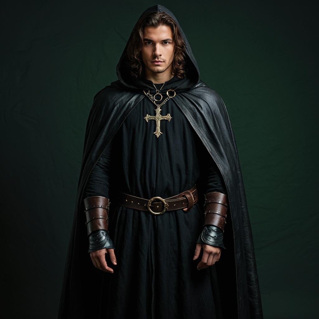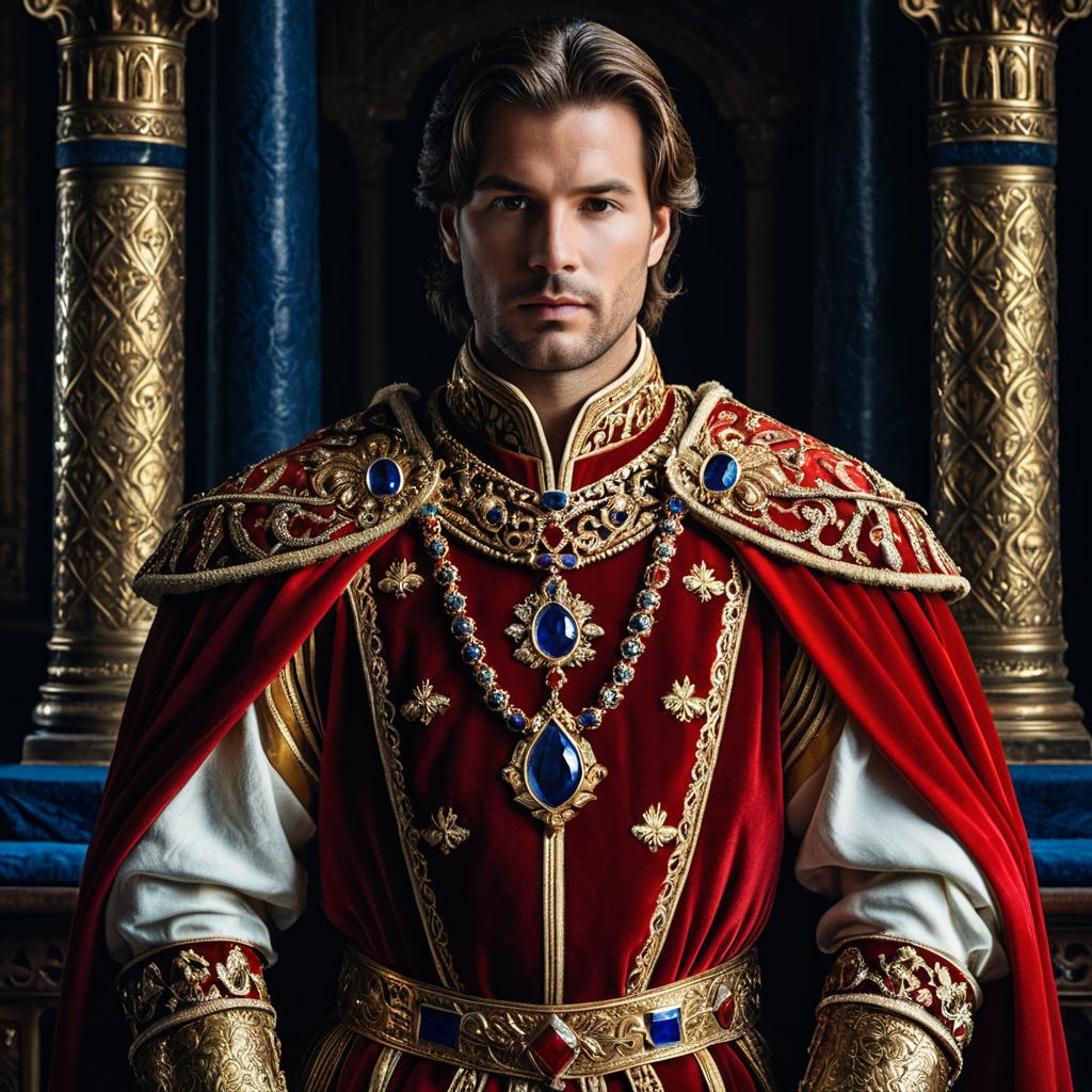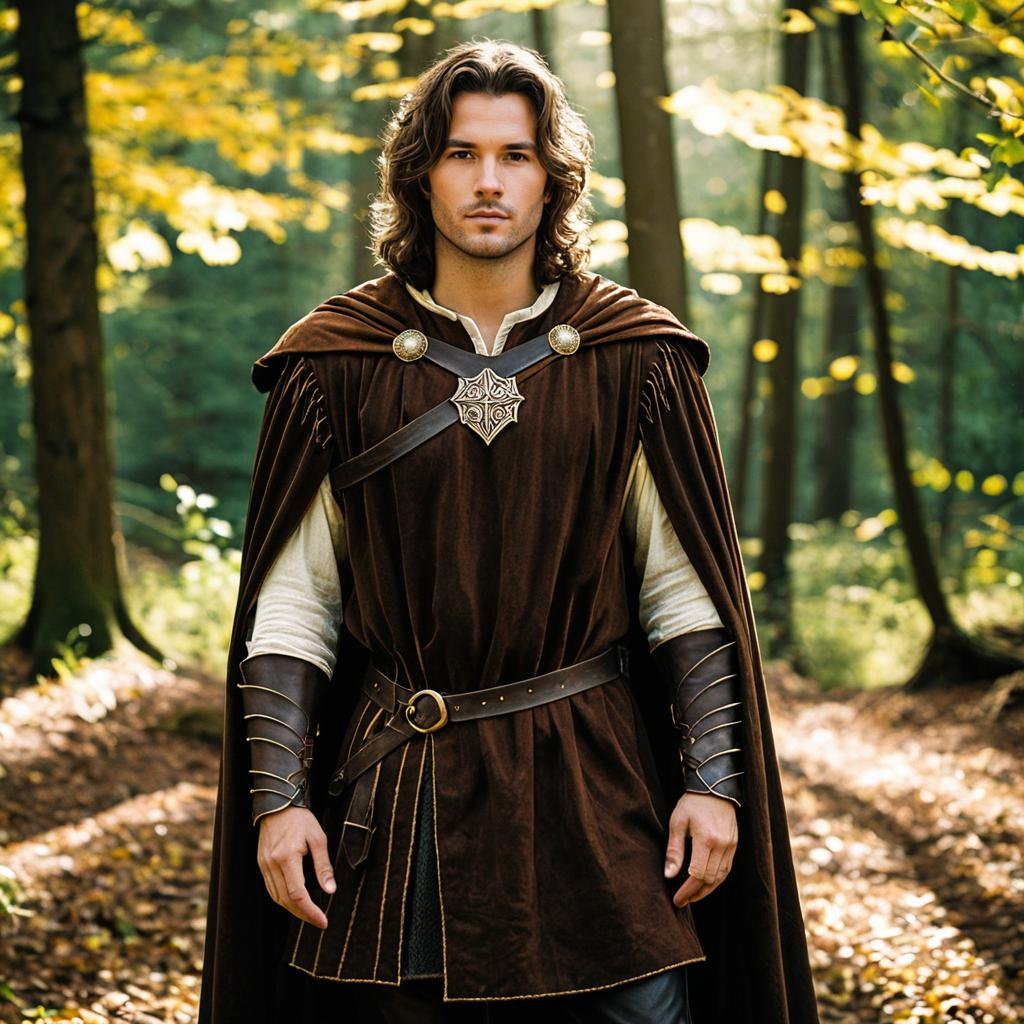 Famous person fancy dress, photorealistic, young handsome man, caucasian, light brown wavy hair, blue eyes, wearing medieval-style green and gold robe, detailed embroidery, red crisscross at neck, brown belt with ornate buckle, standing in city street, blurred background with people, daytime, soft natural light, slightly serious expression, medium shot, realistic ures, historical clothing, medieval fashion, cityscape, outdoor setting, portrait, cinematic quality