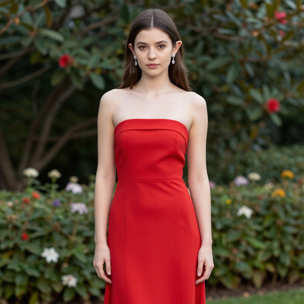 Photograph of a young woman standing outdoors in a garden. She has long, straight dark brown hair and fair skin, wearing a strapless, bright red, form-fitting dress that extends to her ankles. She has small, delicate earrings and a neutral expression. The background is blurred but shows lush green foliage with various colorful flowers, including red, yellow, and white blooms. The lighting is natural, highlighting her dress and the garden setting.