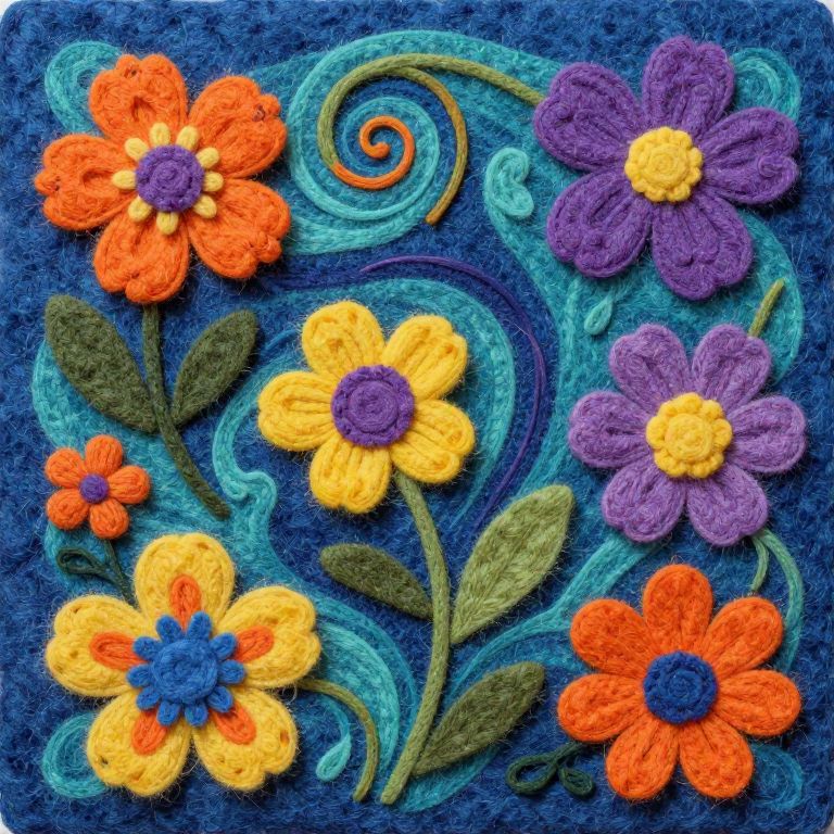 A vibrant textile artwork featuring felted flowers in various colors including orange, yellow, purple, and blue, set against a deep blue and teal swirling background. The piece showcases intricate hand-crafted felt and wool texture, with floral patterns and spiral motifs creating a dynamic and artistic composition.