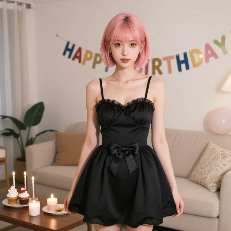 A sweet 18-year-old girl with a soft pink pixie cut and wide, expressive brown eyes in a cute mini black birthday dress with a bow at the waist, standing in a bright, decorated living room with candles, cupcakes, and a 'Happy Birthday' banner, warm indoor lighting, natural skin tones, photo-realistic detail.