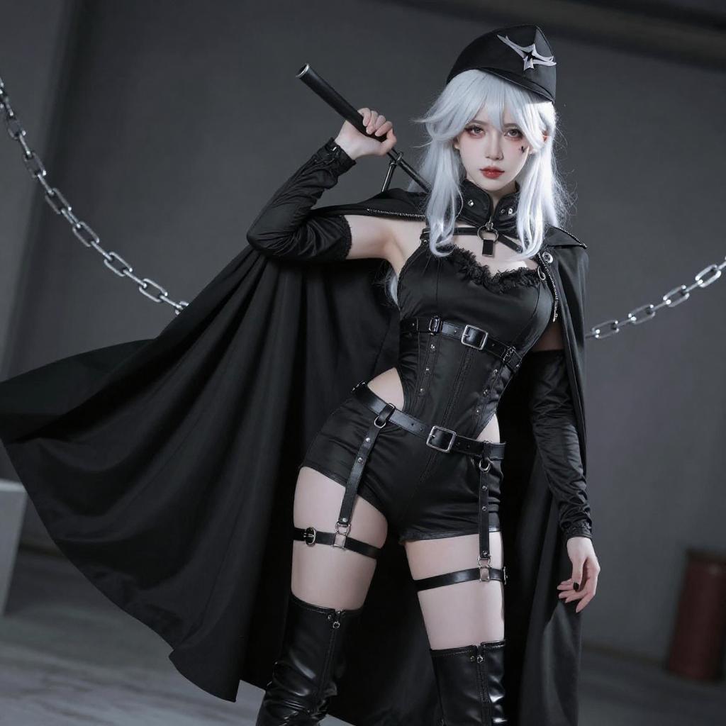 Digital artwork of a white-haired woman in black military-style attire, kneeling with arms raised and chained above her head. She wears a black cap, gloves, and boots, with a white shirt and black harness. Her expression is slightly open-mouthed, and the background is stark white, emphasizing her dark outfit and chains.