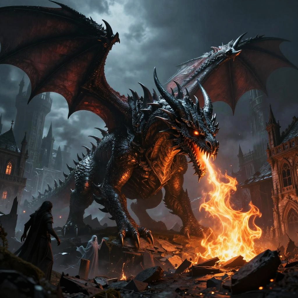 A four-panel digital illustration depicts a massive, black-scaled dragon with sharp horns and a fierce expression. The dragon roars against dramatic, cloud-filled skies. Top left shows a dark, stormy sky with the dragon's snarling face. Top right features the dragon with glowing orange flames in its mouth and fiery clouds. Bottom left has a sunset behind the dragon's head, casting an orange glow. Bottom right showcases the dragon amidst dark, ominous clouds. The cityscape in the background includes tall buildings, adding a sense of scale to the dragon's enormity. The artwork uses vibrant colors, dramatic lighting, and realistic textures to create a dynamic, fantasy-style scene.