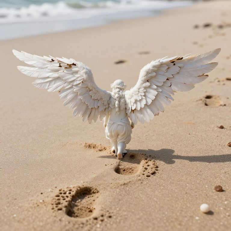 Porous highly detailed and hyperrealistic depiction of footprints from an angel with broken wings on a beach leading away from the camera, photographic quality,