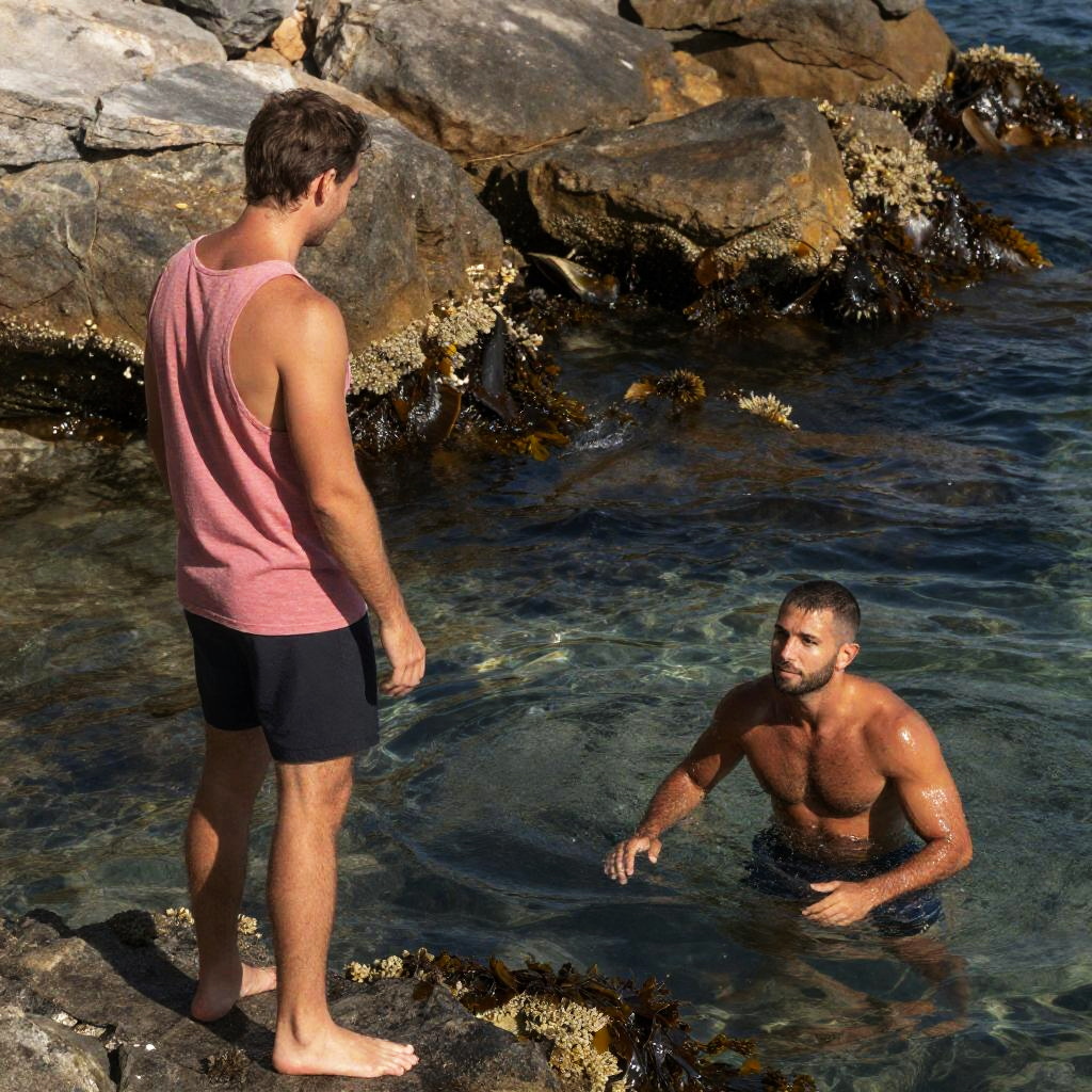 Photograph of two people by a rocky shore. A man in a pink tank top with short brown hair stands on rocks, facing a man with a muscular build and short hair swimming in clear water. Rocks and seaweed in the background. The man in the water is partially submerged. Sunlight highlights the scene.